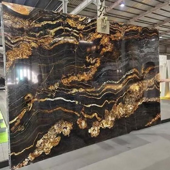 A luxurious blend of golden and deep charcoal waves, Titanium Gold adds bold elegance to countertops, walls, and high-end interiors.